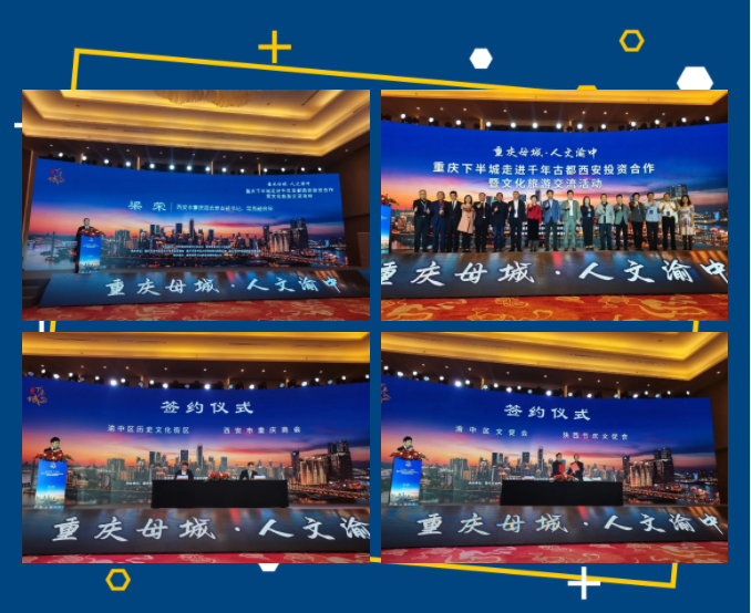 渝中区历史文化街区管委会与西安市重庆商会签订战略合作协议。渝中区文旅企业发展促进会与陕西节庆文化促进会签订战略合作协议。重庆渝中母城文化公司与陕西渝商投资有限公司、重庆长嘉文化旅游有限公司与陕西欧卡电子智能科技有限公司分别签订战略合作协议。